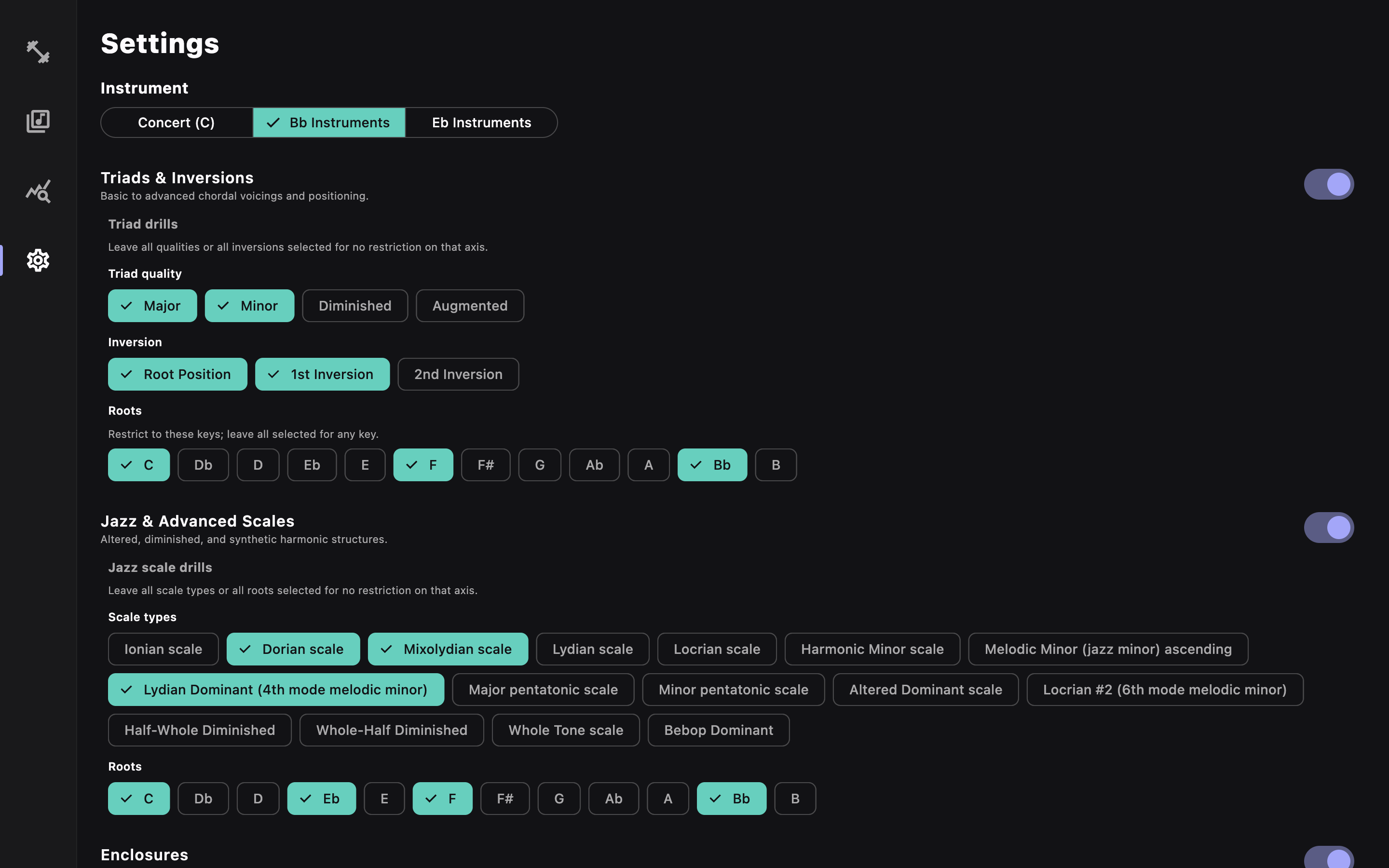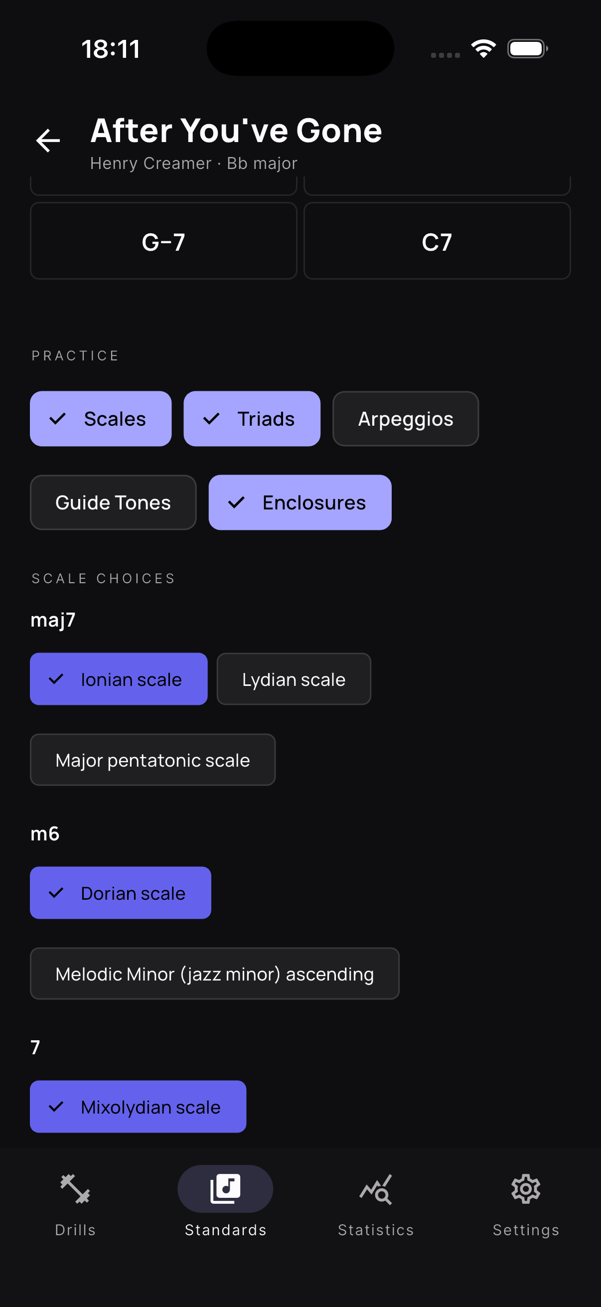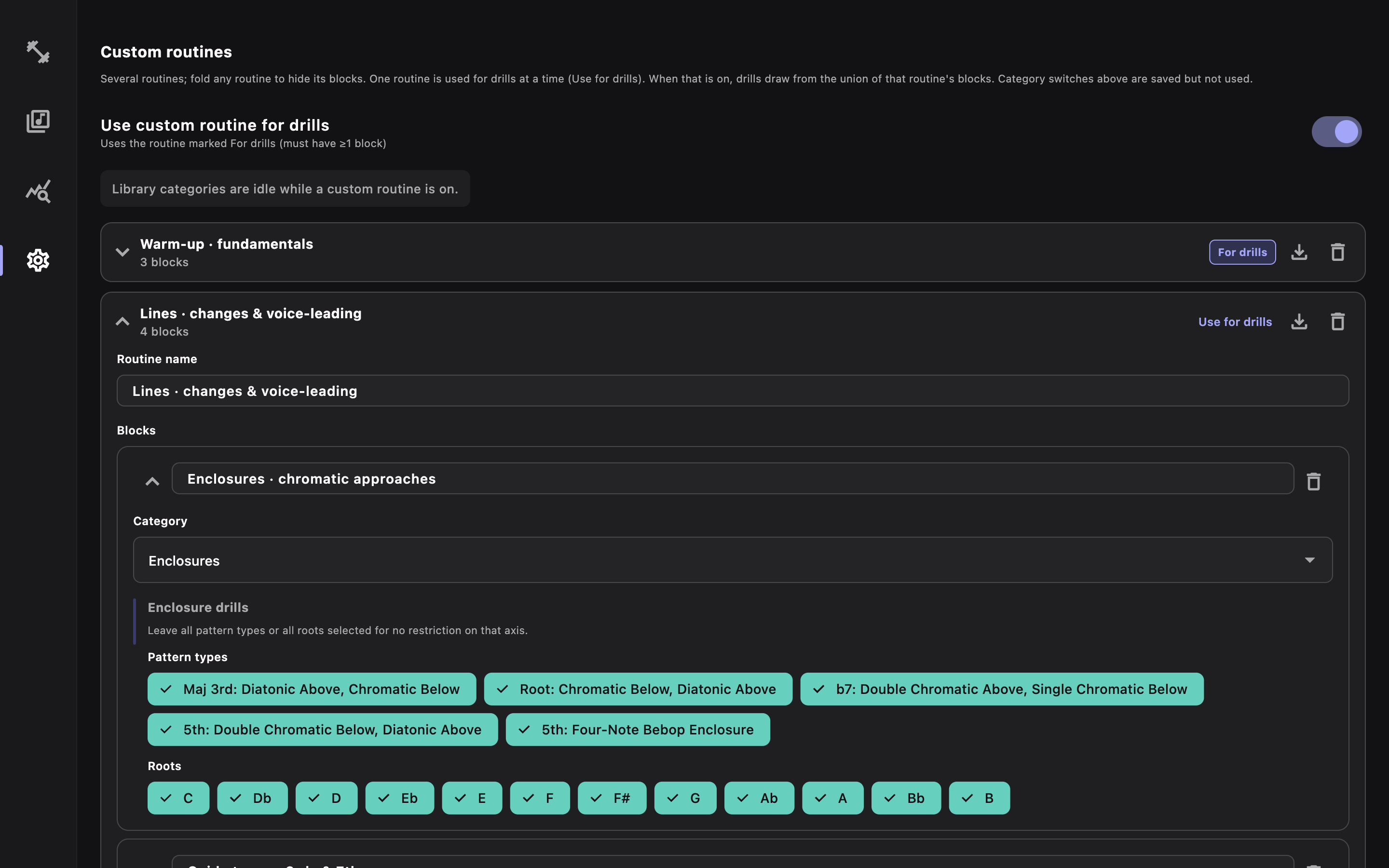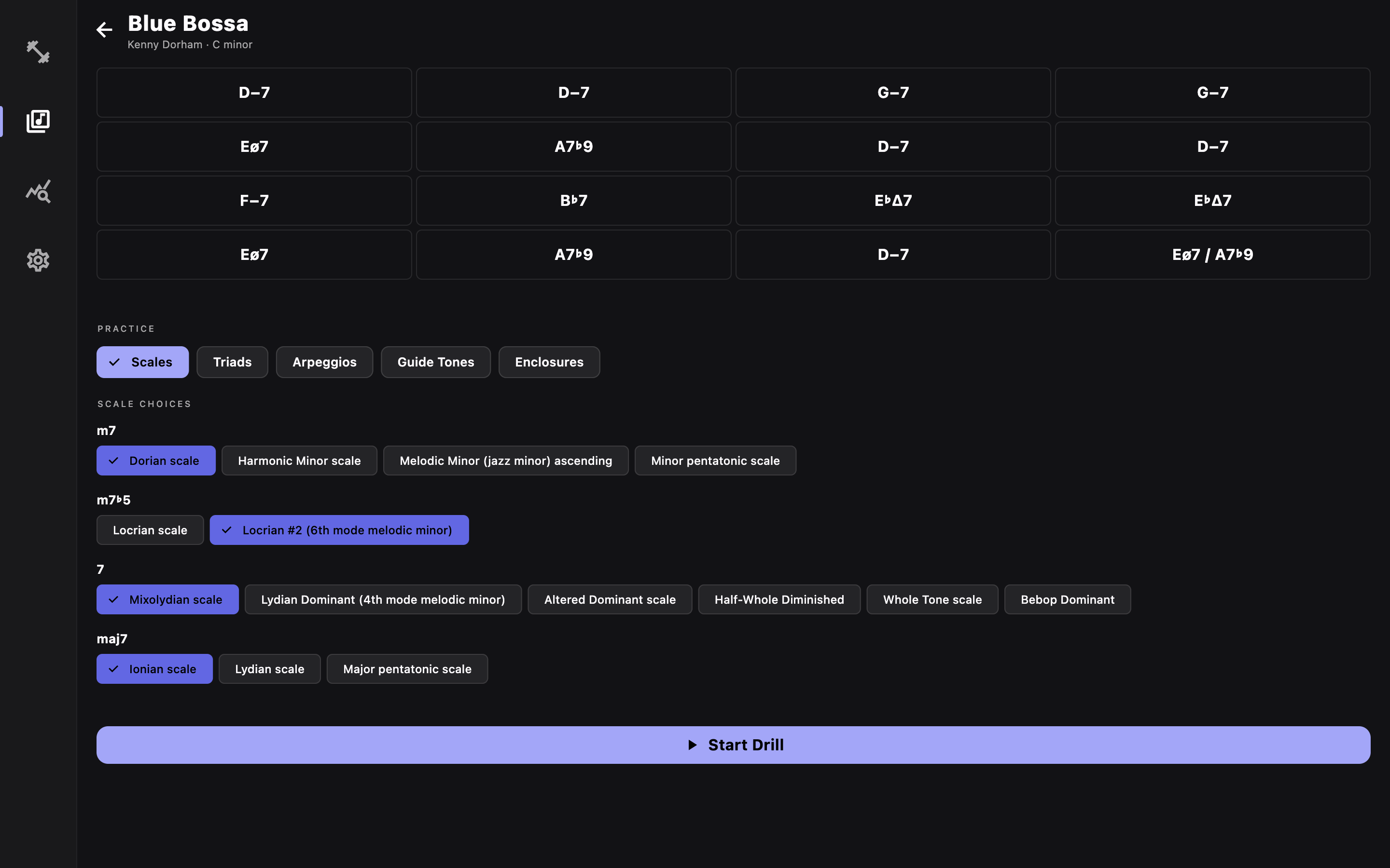 Scales, arpeggios, guide tones, progressions, and more — organized so you can drill exactly what you need.