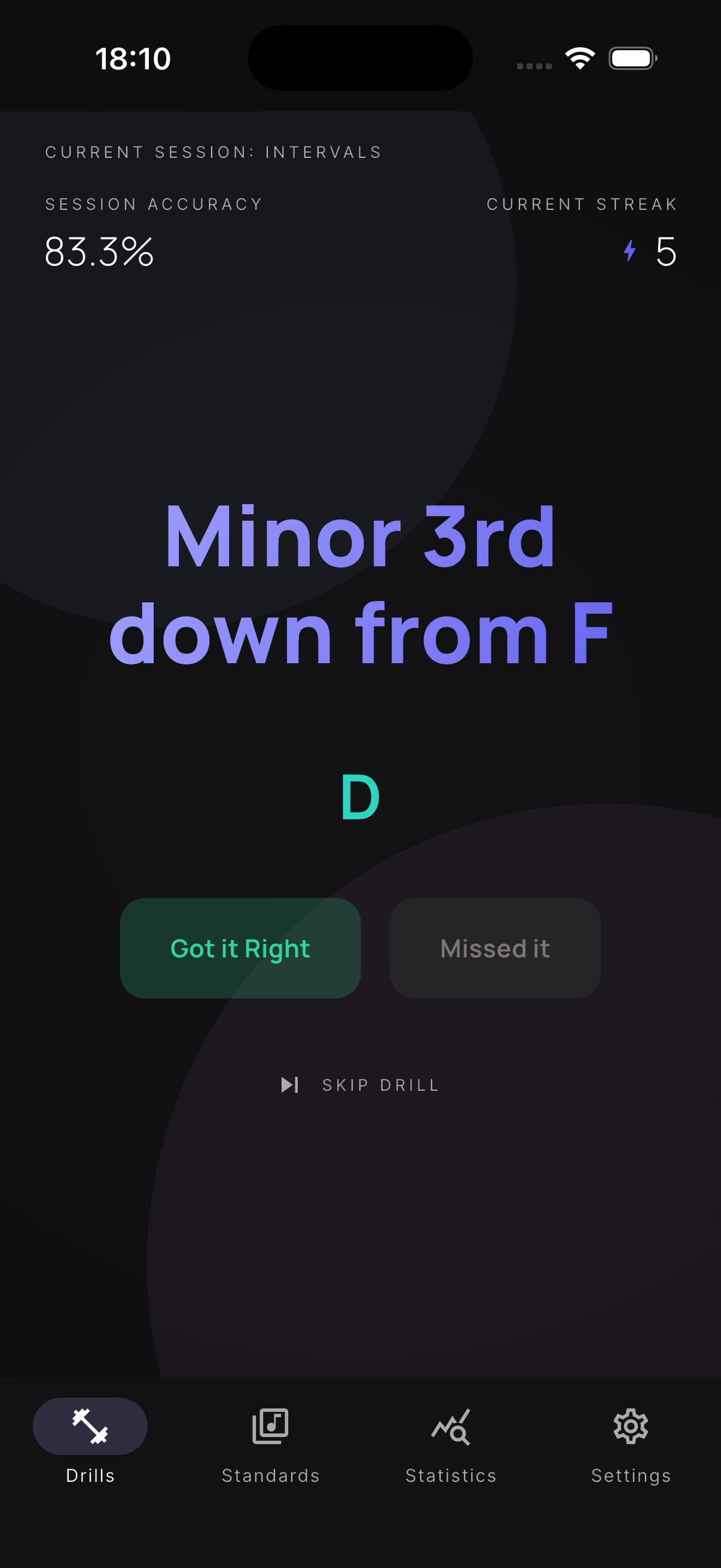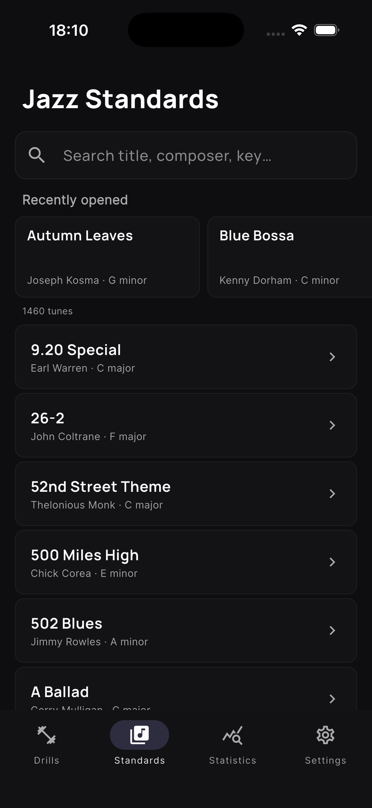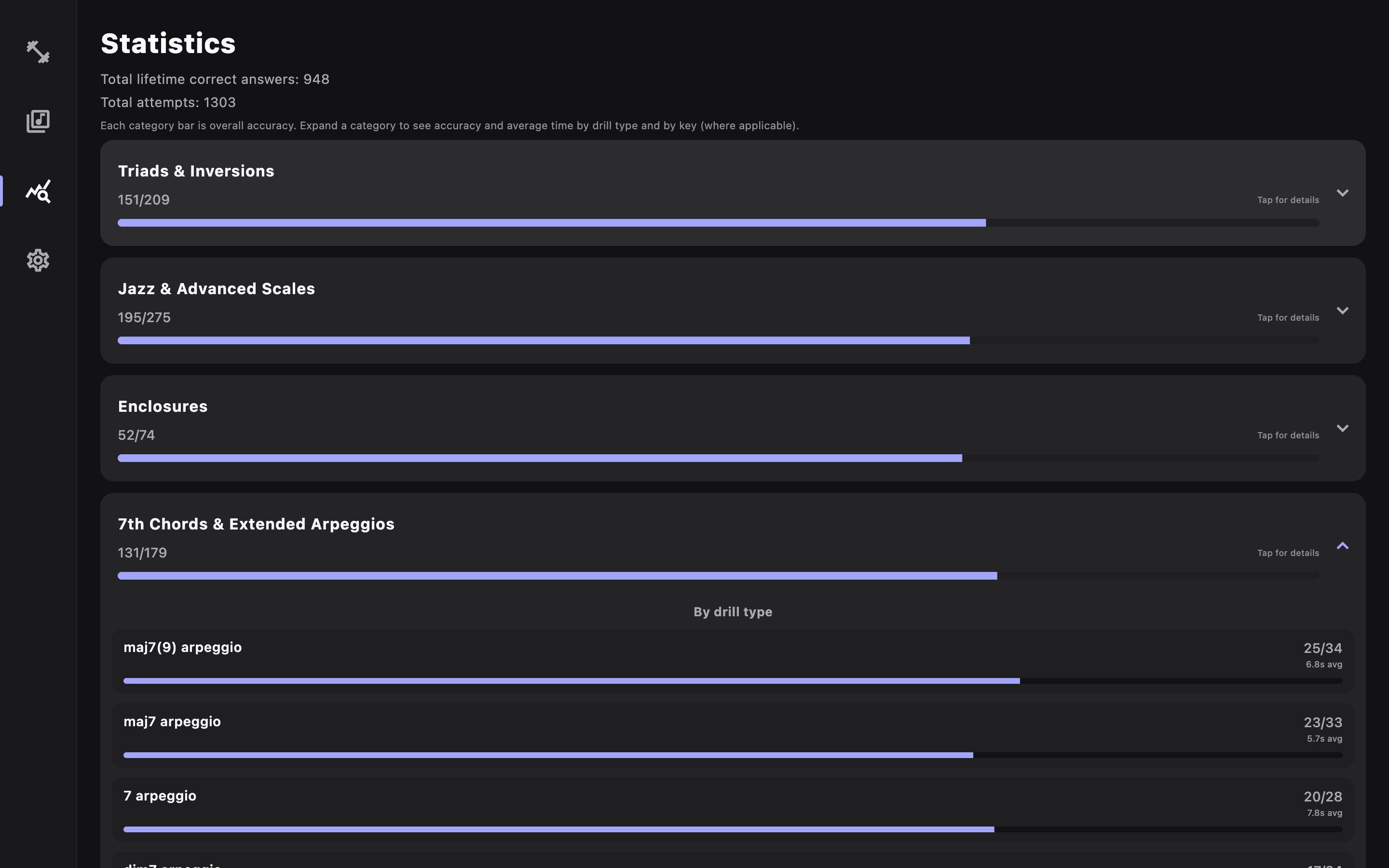 Stats and streaks so you can see growth — not just effort — across categories and keys.
